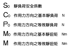 為沿作用方向下之靜負荷;在此靜負荷下,於滾珠與軌道接觸面中心點產生最大計算應力,