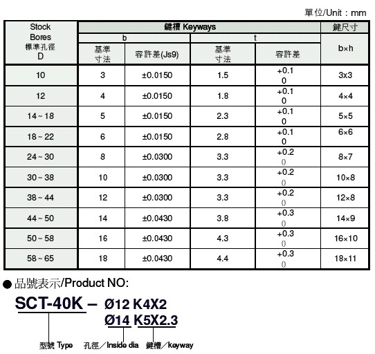 ●各式聯軸器均附有不同標準孔徑,另可加工鍵槽。