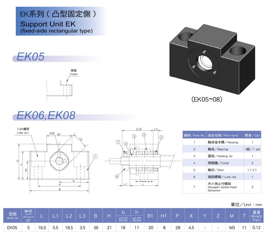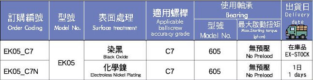 1.EK05~EK08 C7級使用6字頭軸承,軸向需輕負荷,間隙約0.05~0.1mm.(欲訂此規格請先洽詢技術資料)