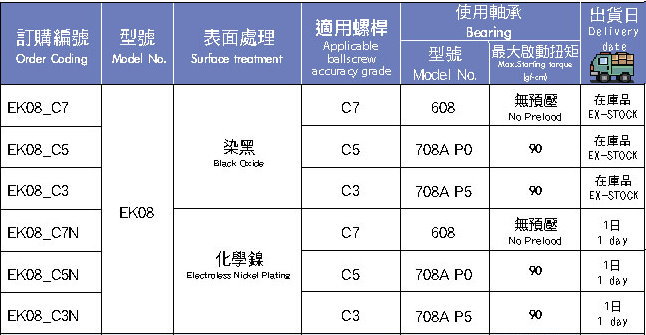 1.EK05~EK08 C7級使用6字頭軸承,軸向需輕負荷,間隙約0.05~0.1mm.(欲訂此規格請先洽詢技術資料)