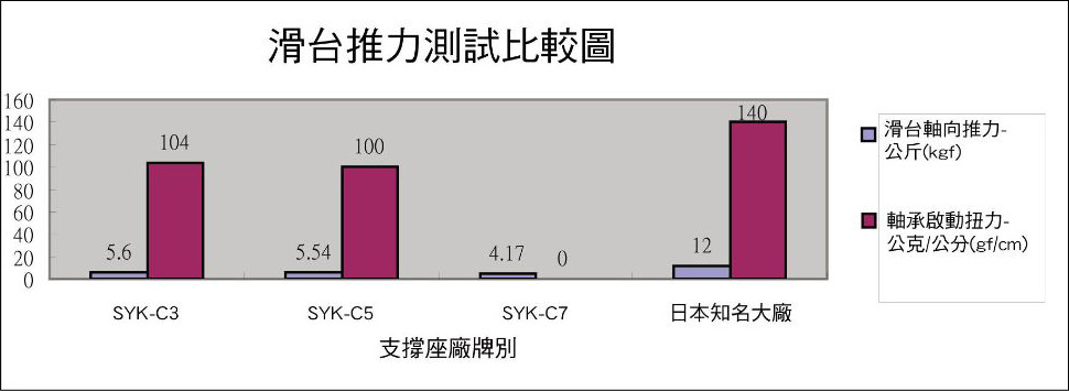 測試固定端的軸承啟動扭力與滑台推力兩數據之結果(如下表),達到軸承於適當預壓內 之最佳啟動扭力數值的管控,其優點在使用相同馬達條件下,可得到最佳扭力輸出值。